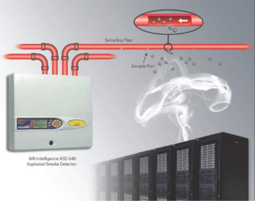 High Sensitivity Smoke Detection systems comprise an air sampling unit (ASU) from which red air sampling pipework is routed throughout the protected area.